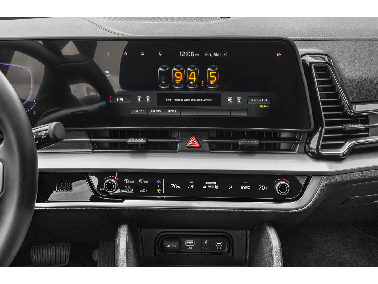 - Radio: AM/FM/HD Audio System -inc: 12.3" touchscreen, navigation, satellite radio, 6 speakers, Apple Carplay and Android Auto, Kia Connect, WiFi, map OTA, voice recognition, USB, steering wheel audio controls and Bluetooth Hands-free phone and streaming audio
